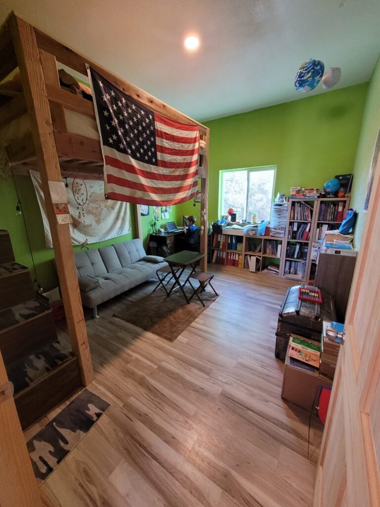 Jesse’s Spielzimmer (Space-Thema) Auf dem Bild ist die Treppe/Regal fuer zukuenftiges Hochbett