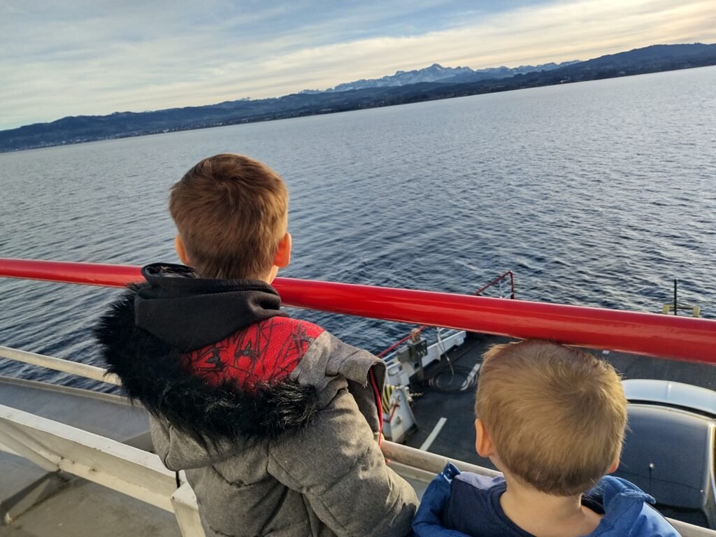 Blick vom Bodensee auf die Schweiz mit der Faehre von Friedrichshafen nach Romanshorn.