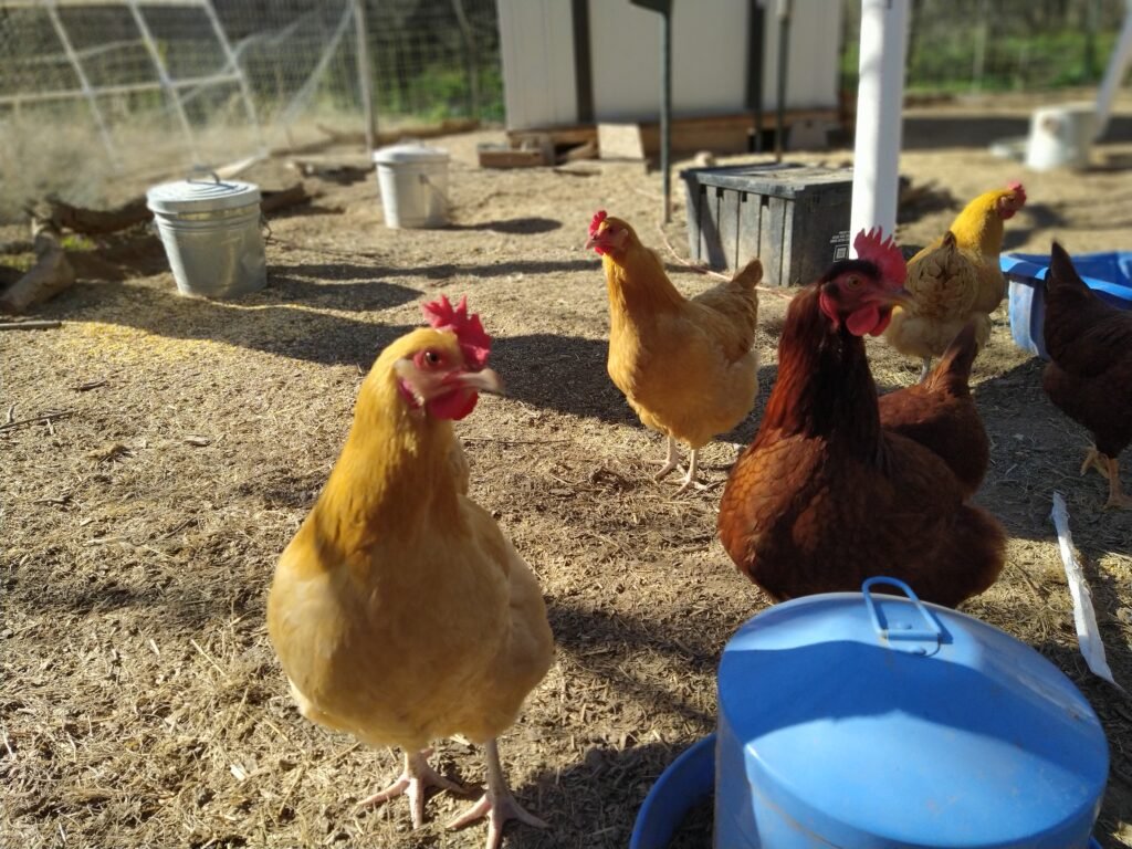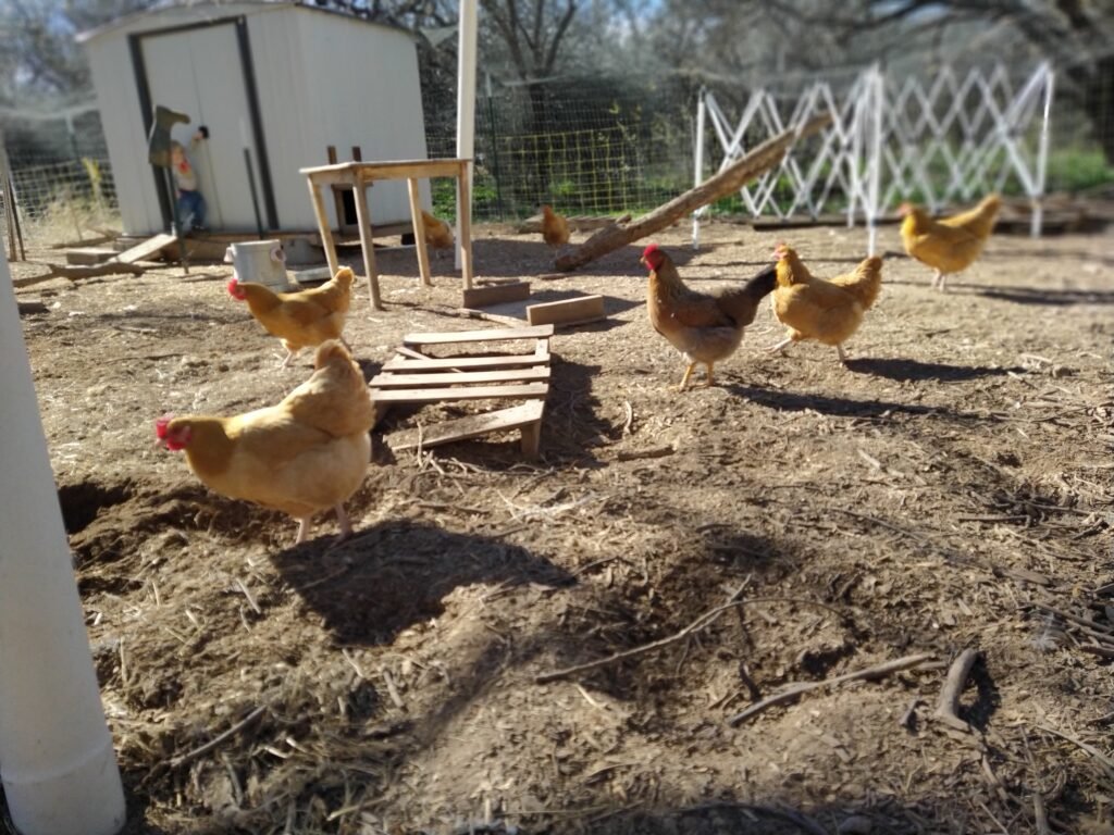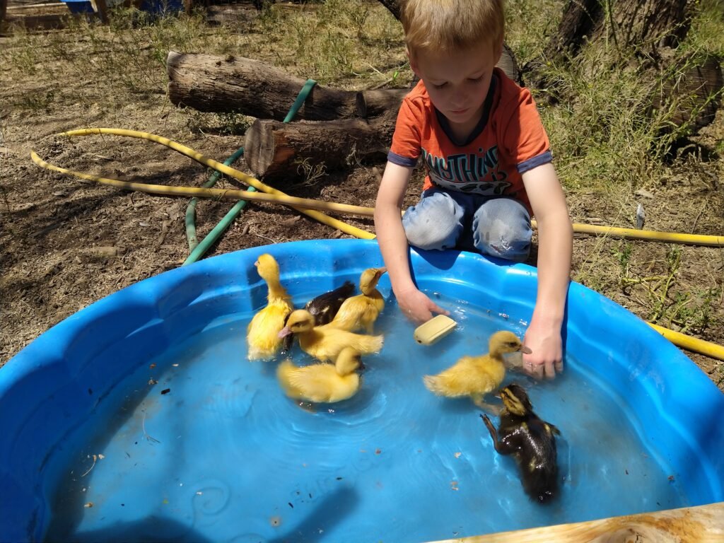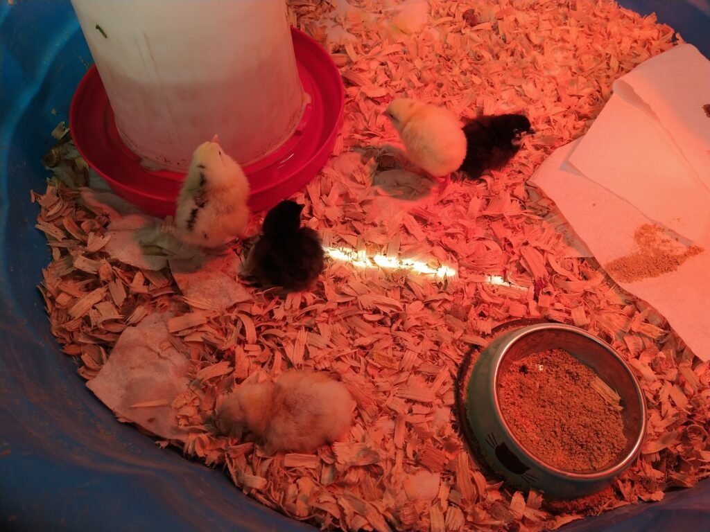Babychicks: Wir haben Michael’s Preschool 10Eier zum mit Brutapparat ausgeliehen, 5 Küken sind daraus geschlüpft und auf unsere Farm eingezogen: